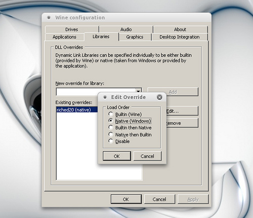 4.在这个点儿,可能PPT无法启动。在”应用程序–Wine–Configure Wine“,点击“函数库”,在“新增函数库顶替”–写入“riched20.dll”,然后点击“添加”。再点击刚刚添加的“riched20”文件,点击“编辑”,选择“原装(Windows)”.