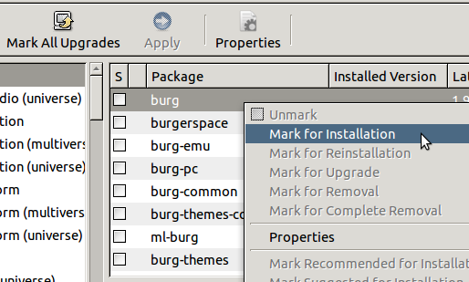 完成以后,打开新立德软件包管理器,搜索 burg,然后标记,以便安装.