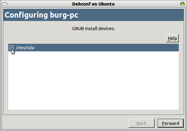 第二个窗口时你需要告诉burg安装在什么地方.选择你的Ubuntu的根驱动器,如果你有/boot目录的话,就选择/boot目录.