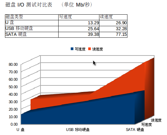 从这两份数据可以看出,在写入速度方面, 移动硬盘明显要比 U 盘快了一倍,这样性能改善不少。