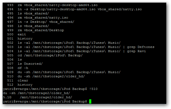 要想执行历史中的某一条命令,只要用 !加上命令前的行号就可以了.