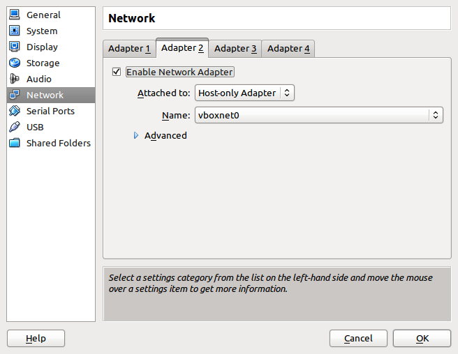 VirtualBox的guest一般默认为使用NAT,这样host就不能ping guest或者是访问guest的服务。一种解决办法是把guest的网络设置从NAT改成Bridged Adapter。另一种方法则是为guest新加一个Host-only Adapter,如下图: