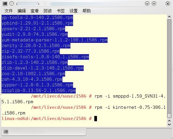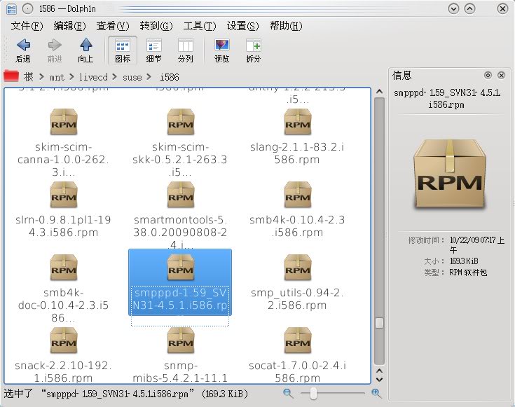 挂载以后,浏览到 /suse/i586/ 目录,里面应该包含有 kinternet 和 smpppd 这两个 RPM 包