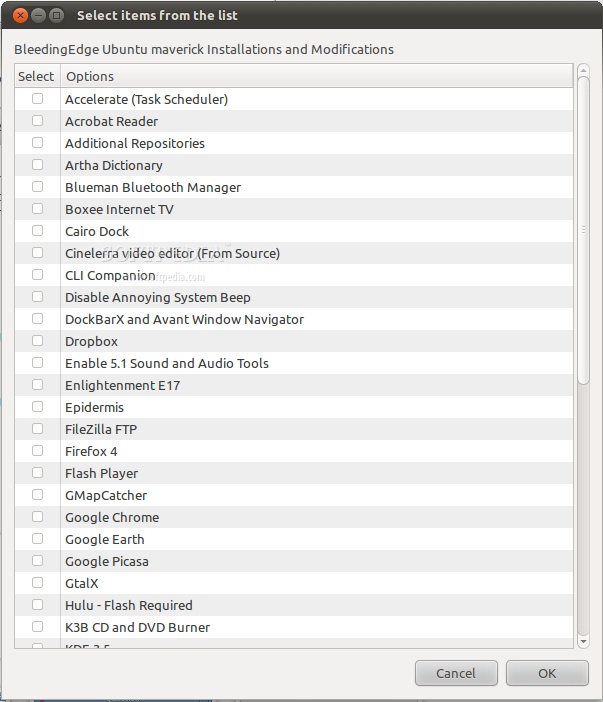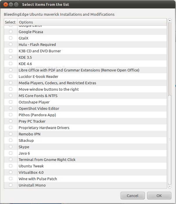 KDE 3.5; KDE SC 4.6; LibreOffice (with Grammar and PDF support); Mozilla Firefox 4; Microsoft fonts; NTFS support; VirtualBox 4; Wine (with the Pulse patch); Ubuntu Tweak; Enlightenment E17 window manager; Java Runtime Environment 6; OpenShot video editor; Skype; SBackup; Boxee Internet TV; Cairo dock; DockBarX dock; Avant Window Navigator dock; Adobe Acrobat Reader; Adobe Flash Player; Accelerate (Task Scheduler); Artha Dictionary; Blueman Bluetooth Manager; Dropbox client; Google Earth; Google Picasa; Cinelerra video editor; CLI Companion; Epidermis; Filezilla FTP client; GMapCatcher; Lucidor e-book reader; Octoshape player; Pithos (client for Pandora); GtalX; Hulu; K3B CD/DVD burning tool; Remobo IPN; Prey PC tracker; Video and audio codecs.等等,很多了,不再列举。