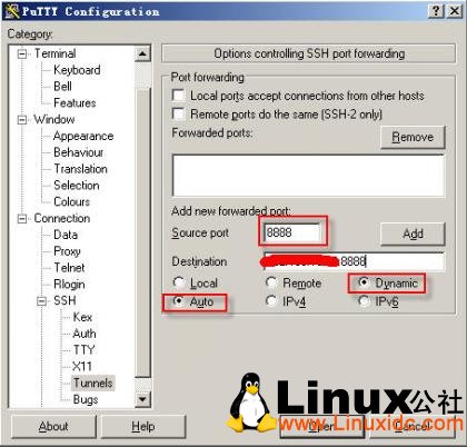 在putty的登录设置中配置tunnel,目标设置为Dynamic,添加一个端口8888(普通用户需要1024以上端口),再按Add,一个动态转发端口就实现了;