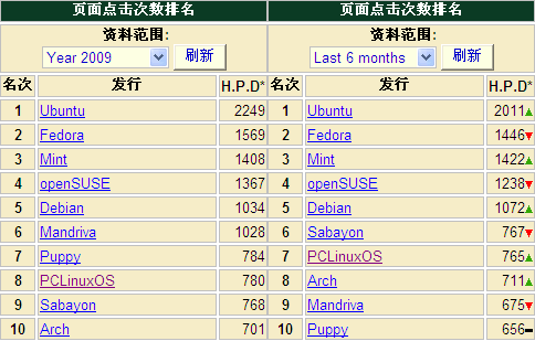 我们发现2009年在distrowatch前十年名的linux操作系统,2010年仍然是它们,只不过彼此的位置有所变化。但是,前五名的排名相对比较固定。下图显示了Linux操作系统内部排名的对比。