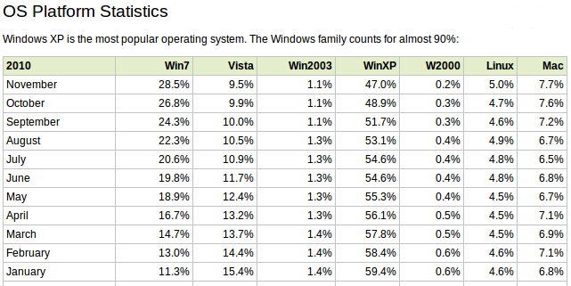 那么,在Linux操作系统与其他操作系统的对比过程中,2010年的Linux操作系统可以说非常“给力”。根据近期,著名的Web开发门户网站W3schools的一份系统平台统计报告显示:2010年11月份Linux系统的市场占有率已突破5%关口。