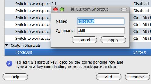 这个 Tips 用到了 xkill 命令,一个在桌面用的杀死图形界面的程序,Ubuntu 上是默认安装的,所以无需重新安装。你需要做的就是在 系统-> 属性-> 键盘快捷键 中添加一个自定义快捷键(如下图)命令,然后定义一个快捷键,我用的是 Shift + X ,使用的时候直接按 Shift + X 然后点击无响应的程序,就可以快速关闭该程序了。