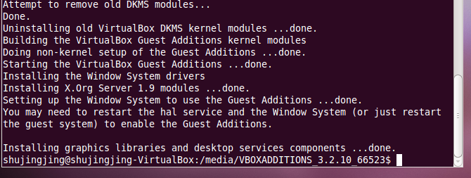 5.终端中输入命令:sudo ./VBoxLinuxAdditions-x86.run,开始安装增强功能,注意上述命令仅适于32位系统,64位系统请选择相应的命令,安装过程及安装完成后终端的输出见下图,
