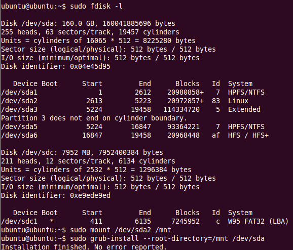 先看硬盘上Ubuntu分区号,然后挂载,最后安装grub2,指定根目录。