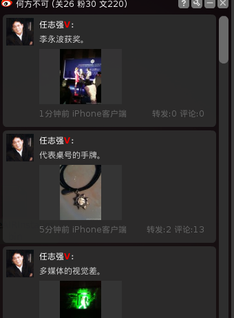 很久没有上微博了,腾讯微博还是sina微博呢?现在国内的微博老大只有腾讯微博和sina微博,网易微博和搜狐微博可能要歇菜了。但是腾讯微博的最大问题就是,隐私问题!现在QQ上的很多好友都是在腾讯微博上了,我不是很喜欢这些好友都是知道我心理面在想什么的,总体说起来,我是一个比较内向的人,更加多的时候,我更加希望微博可以是我自己说自己心里话的地方,将自己的所思所想都是记录下来的。