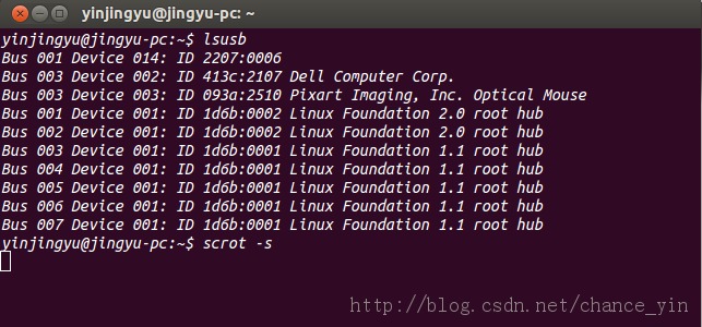 执行命令: lsusb , 找到自己的usb设备(如图),我的设备条目是: Bus 001 Device 014:ID 2207 : 0006