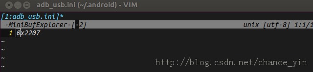 5、执行命令, vi ~/.android/adb_usb.ini 创建 adb_usb.ini,把刚才找到的设备的idVendor添加进去