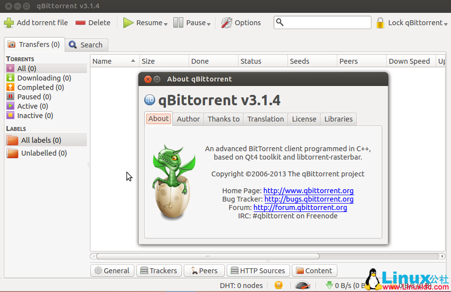 FEATURE: Statistics dialog (Gelmir) FEATURE: Tooltips explaining each peer's connection flags (sledgehammer999) FEATURE: Win/Mac Check for program updates every 15min and allow the user to manually check for updates through the help menu. (sledgehammer999) BUGFIX: Better dialog message for torrent delete confirmation (sledgehammer999) BUGFIX: Fix resizing grip location. Closes #1146. (sledgehammer999) BUGFIX: Lock toolbar in place. Closes #1144. (sledgehammer999) BUGFIX: Second attempt at fixing saving settings on shutdown. (sledgehammer999) BUGFIX: Sort labels in ‘Add new torrent' dialog. Closes #1150 #411. (sledgehammer999) LINUX: Fix build under Ubuntu 13.10 (sledgehammer999) LINUX: Make sleep and shutdown functions work on systemd's logind (Faheem Pervez)Ubuntu下安装qBittorrent v3.1.4方法如下: