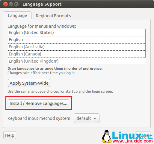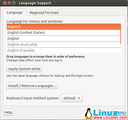 如果提示要你安装额外的语言支持,那就直接安装。如果没有,那么就单击 Install / Remove (安装/删除)去安装新的语言包,然后,选择你想安装的语言来安装。最后,拖动新的语言到列表的顶端并且保存。这些更改只会应用在你的个人帐号上。如果你想应用在全局范围内,单击 Apply System-Wide(应用到全局设置) 。
