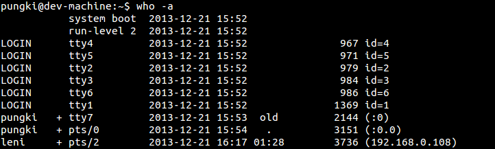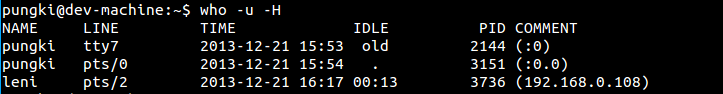 空闲时间 包含了最近最后一次活动以来消逝的时间. 所以,00:13 意思是 用户leni已经13分钟没执行过命令了. (.)符号 是指该终端过去的一分钟有过活动。在那期间,我们称之为 “current” 。PID 是用户shell程序的进程ID号。
