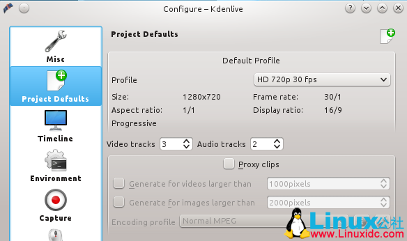 这是我的屏幕录像的设置:高清720p每秒30帧,1280x720的屏幕尺寸。如何知道该使用什么设置项? Google上有一些说明。设置这些值可到Settings > Configure Kdenlive > Project Defaults > Default Profile > HD 720p 30fps(图1)。