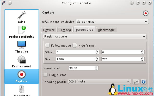 设置捕捉屏幕的大小到 Settings > Configure Kdenlive > Capture > Screen Grab(图2)。虽然你也可以选择捕捉全屏幕,但最好还是坚持用YouTube规定的尺寸。因为如果使用的尺寸与YouTube规定的不一样,则YouTube将增加黑边来达到合适的尺寸。热切的观众会更加希望看到一个充满生动的内容的屏幕,而不是黑边。