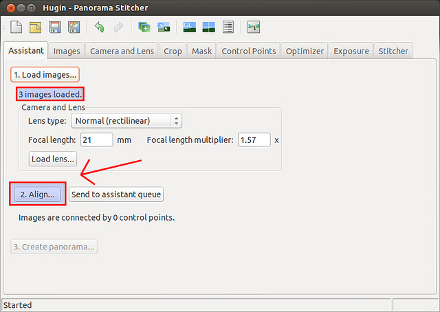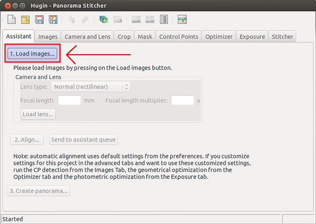 在这儿(Assistant页),我们要做的第一件事就是导入我们想要合并的照片。我们先来点击Load images 按钮,然后导入(两张或者多张)图片。当然了,这些照片应该需要相互有一些重叠的部分(我们这里载入了三张)。