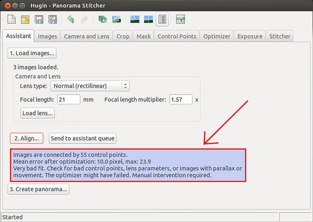 接下来让我们切换回 Hugin 的主窗口。在 Align 按钮的下方,你将会看见照片合并的状态(比如控制点的数量,错误情况)。当然,还会有合并好坏的相关提示。