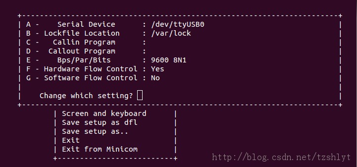 6、键入对应字母进行配置,这里设置为 /dev/ttyUSB0 ,9600波特率(据各自情况而定),回车保存退出