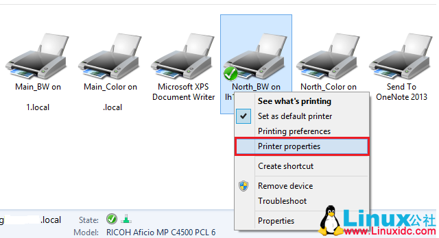 首先,登入Windows,右击你要共享的打印机,然后点击‘Printer properties(打印机属性)’