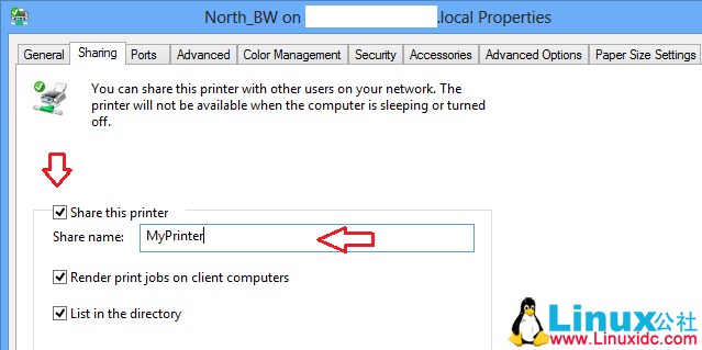接着,选择“Sharing(共享)”标签页,勾选‘Share this printer(共享这台打印机)’复选框来共享。记住共享打印机的名字,因为你要使用这个共享名来连接这台打印机。