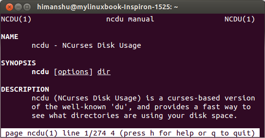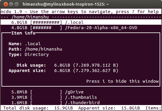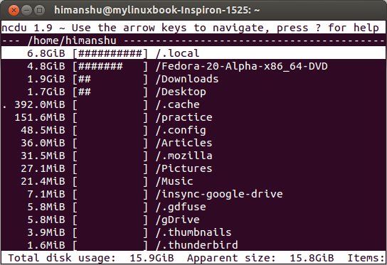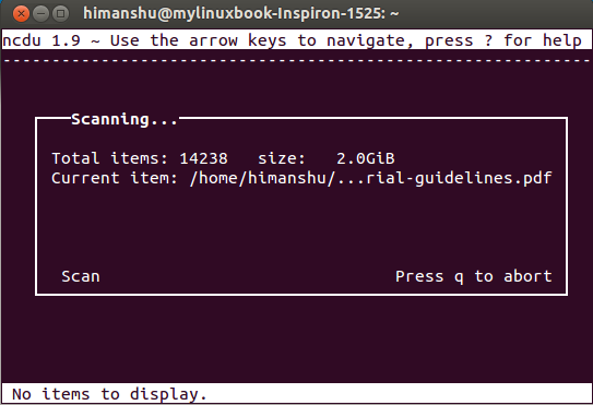 你会看到在输出里显示了一个磁盘使用情况表。假如你要扫描整个文件系统,你可以在运行ncdu命令时加上-x选项。