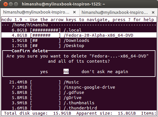 如你所见,ncdu请求用户确认。假如你选择yes,目录将会从系统中删除。