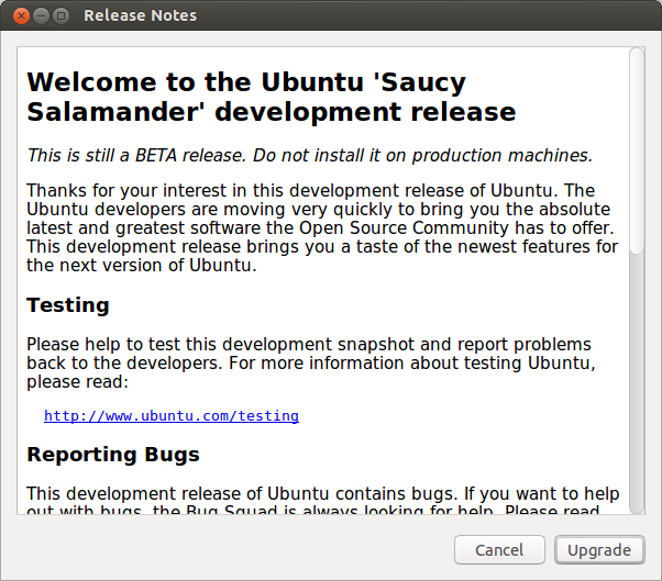 温馨提示:在升级之前,将你的数据在外部设备(u盘或CD / DVD)上做一份完整的备份外部设备。另外,这里是以测试版本进行的升级,建议不要用在生产环境中。Ubuntu 13.10稳定版将于10月17日发布。而Ubuntu 13.10最终测试版已经在一个星期前发布。