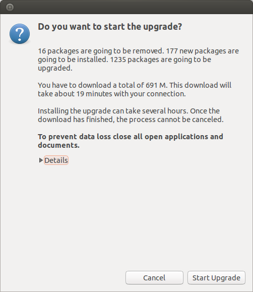 软件更新会向你确认是否要升级。点击Start Upgrade(开始升级),开始安装Ubuntu 13.10。