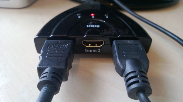 我买的分配器还不到10美元 ,有一个按钮可以选择三个频道,其中我就连接了我主要的那台电脑和树莓派的HDMI线缆。