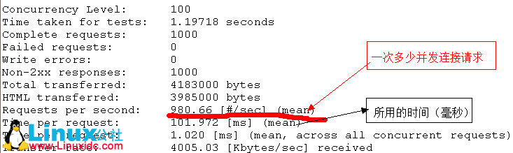 -c并发请求量是在我们执行一次ab的时候,同时一个发送并发连接请求的数量,apache最大的连接请求达不到3000个,而每秒的数量越多,表示它的处理能力是越强的。