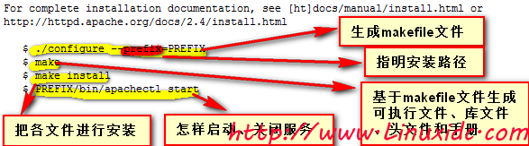 切换到源码被拆解的位置,进入该目录下相应的httpd目录,里边有些特征的文件,如configure(为生成makefile文件)、INSTALL或者README(指导我们安装)。查看INSTALL文件,如下所示