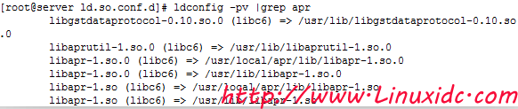 【库文件的处理】在/etc/ld.so.conf.d目录下创建名为apr.conf的文件并进行编辑,输入一个供系统查找库文件的路径/usr/local/apr/lib;保存退出后ldconfig重新加载缓存然后查看。如下图所示,看到库文件可以被找到