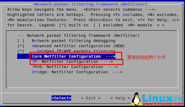//配置内核时,在“Networking ---> Networking Options ---> Network Packet filtering framework (Netfilter) ”处主要注意两个地方: