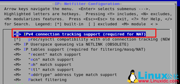 //将“IPv4 connection tracking support (require for NAT)”编译成模块。