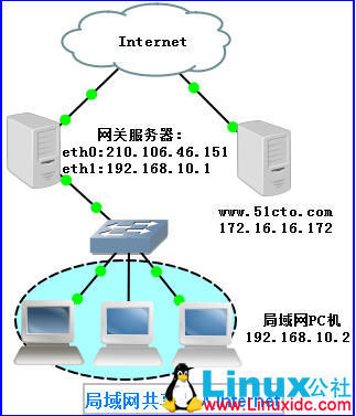 Linux网关服务器两块网卡eth0:210.106.46.151连接Internet、eth1:192.168.10.1连接局域网,开启IP路由功能