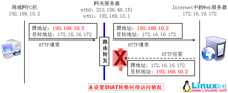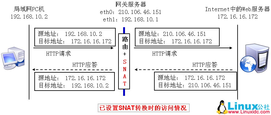 如果该数据包需要从外网接口eth0向外转发,则将其源IP地址192.168.10.2修改为网关的外网接口地址210.106.46.151,然后发送给目标主机。