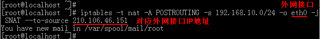 [root@localhost ~]# iptables -t nat -A POSTROUTING -s 192.168.10.0/24 -o eth0 -j SNAT --to-source 210.106.46.151