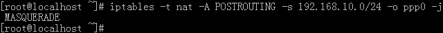 [root@localhost ~]# iptables -t nat -A POSTROUTING -s 192.168.10.0/24 -o ppp0 -j MASQUERADE