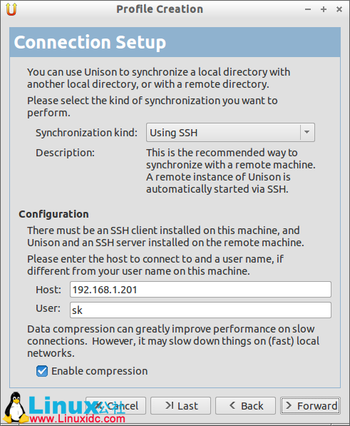 这里会要求你选择同步方法。我想使用SSH,在本地桌面与远程服务器之间同步文件。于是我在这里从Synchronization Kind(同步类别)下拉框中选择Using SSH(使用SSH)。然后输入远程主机服务器的IP地址和用户名称,如下所示,点击Forward(下一步)。