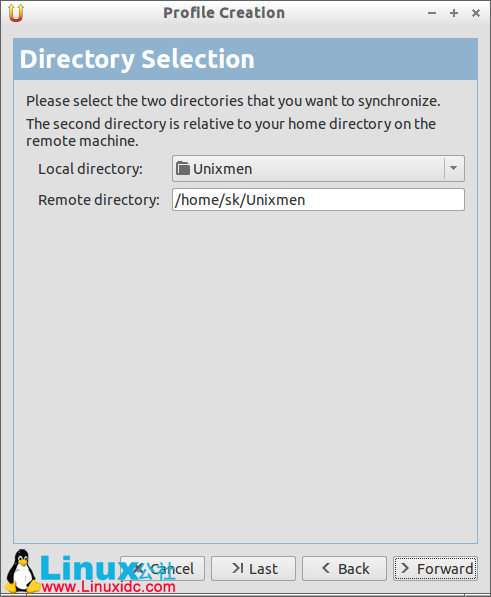 现在,我们得指定需要复制的本地文件夹和远程文件夹。在Local Directory(本地目录)框里面输入本地文件夹的路径(如本文中的/home/sk/Unixmen),在Remote Directory(远程目录)框里面输入远程文件夹的路径。点击Forward(下一步)。