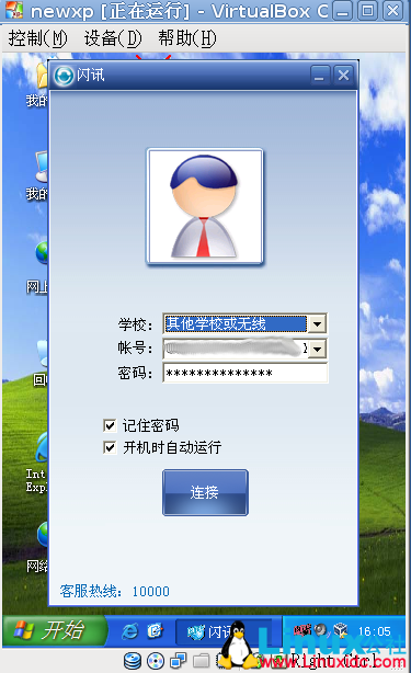 3)目前你的虚拟机已经可以访问你的网线接口了,插上网线,登录闪讯吧。虚拟机里就可以上网了(接下来要作的就是把网络分享给主机)