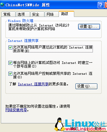 5)右击ChinaNetSNWide,选择属性,高级,勾选允许其他用户通过此连接,点击确定。