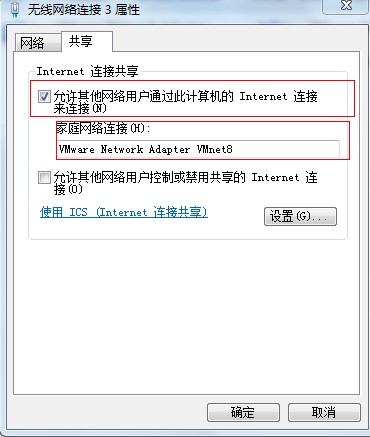 选择“共享”的选项卡,打开网络共享,“允许其它网络用户通过…“,在“家庭网络连接”中选择“VMNet8(VMware NetWork Adpter…)”,然后确定,如图3