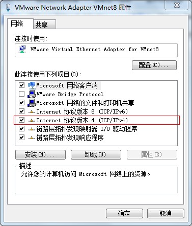 三、配置VM的网络在图1中的VMware Network Adapter VMNet 8上右键,属性,如图4
