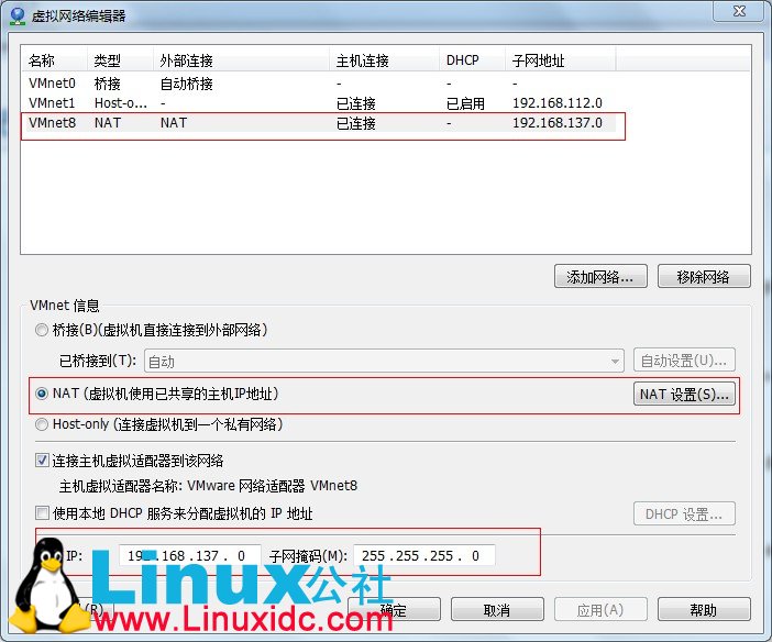 一个是VMNet1(桥接),VMNet8(NAT),具体详情可查阅相关资料,我组建的小型局域网是采用NAT的方式连接。