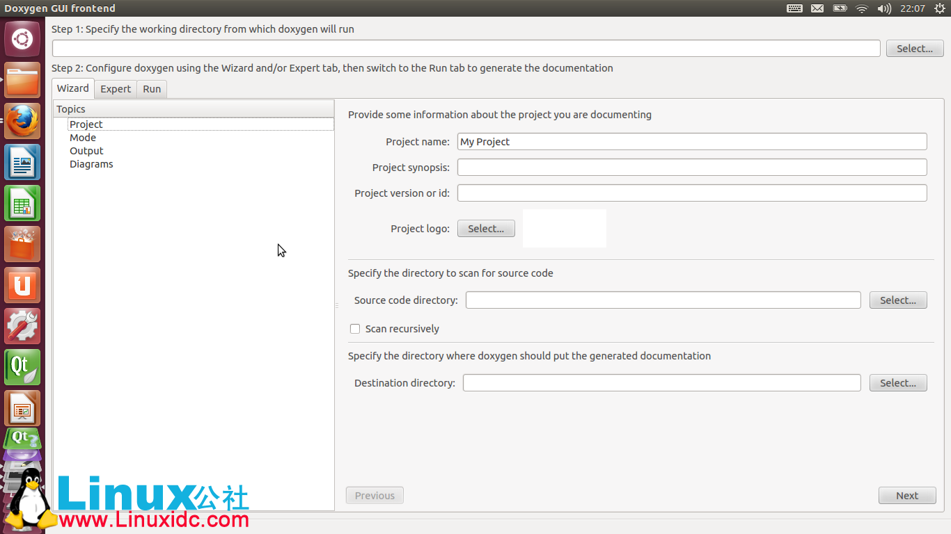 2、Ctrl+Alt+T打开终端,输入doxywizard,会弹出如下的doxygen GUI界面,这个使用起来和Windows XP下使用的doxygen差不多。