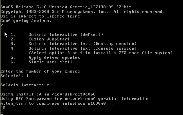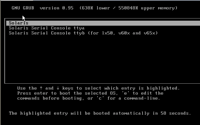 先将虚拟机的光驱指向到Solaris10的iso镜像文件,内存大约1个G左右,硬盘40个G。 出现这个画面的时候直接敲回车,或者在1分钟后默认选择第一个选项。